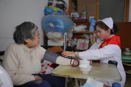 家住顶楼的田大娘是独居空巢老人,子女长年不在家,见到这么多志愿者上门,并且还带了慰问品,田大娘激动的直流眼泪,跟大家更是有说不完的话。田大娘患有卵巢癌,现在长期服药,药品在墙上挂的满满当当,妇儿堂医院护士贴心的为田大娘测量了血压,并叮嘱其日常注意事项。临走时田大娘执意出门相送,舍不得志愿者们的离开。